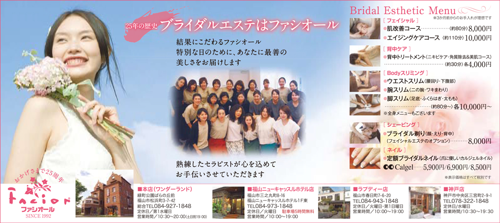 瀬戸内から世界に展開するエステサロン「ファシオール」。福山市に3店舗、神戸三宮に「神戸店」 パリサンジェルマン通りに「パリ店」がオープン。お客様のもつ「自らしい美しさ」を追求し、未来のポジティブライフを応援します。オーガニックコスメ・商品にこだわり、内面から美しくなることを追求する「本物」の商品・技術・サービスを提供する総合エステサロンです。