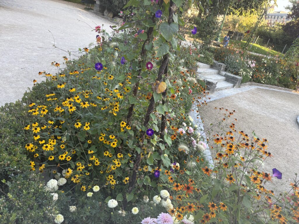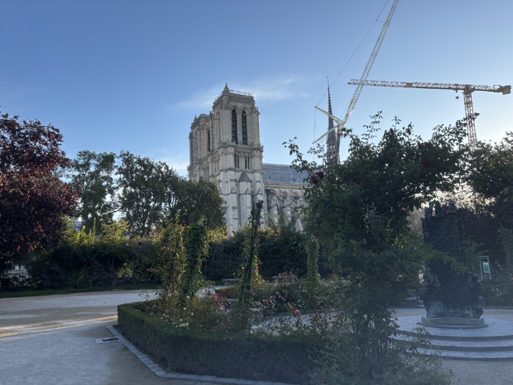 1番にノートルダムさんにご挨拶。パリの公園は年中お花が咲いてます。