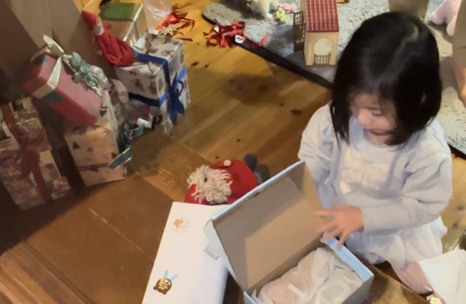↓ 孫3号3人目(みんな女の子)に、サンタさんから、キラキラ靴のギフトがありました。