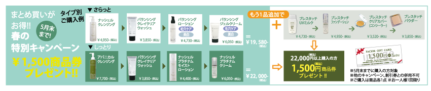 ●基礎化粧品を各1点ずつ合計22000円以上お買い上げの方に1500円の商品券をプレゼント