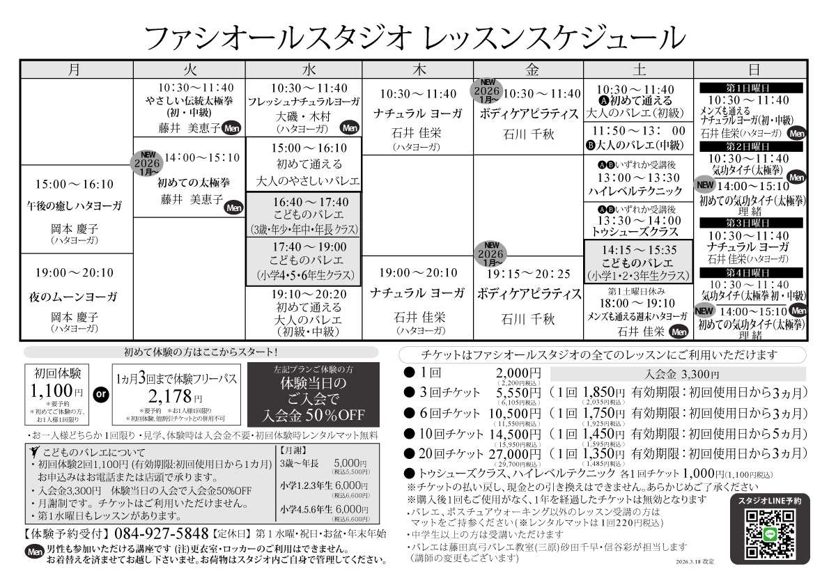 ファシオールスタジオは、福山でヨガ・ピラティス・大人のバレエ・ごとものバレエ・太極拳・気功タイチ太極拳のレッスンが体験できます。全レッスン、アンチエイジング、ボディメイキング、スリミング、シェイプアップ、姿勢矯正効果も期待できるレッスンとなっております。